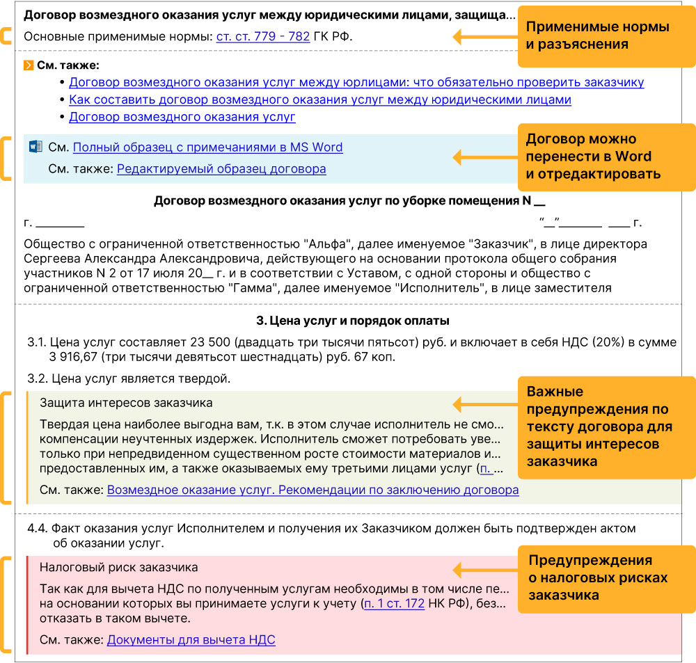 Форма с комментариями о рисках: Договор возмездного оказания услуг между юридическими лицами, защищающий интересы заказчика (образец заполнения)