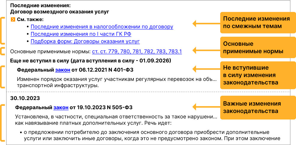 • Поможет проверить последние изменения в регулировании договоров купли-продажи, поставки, подряда, займа, аренды, залога и др.